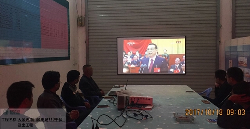 通能公司大余天華山風電場110千伏送出工程監(jiān)理項目部員工集中收黨的十九大開幕實況。