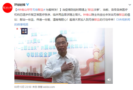 當(dāng)前,受新冠肺炎疫情影響,獻(xiàn)血人數(shù)銳減,血液庫存日益減少,嚴(yán)重影響了血液的正常供應(yīng)。2020年3月13日,鐘南山院士向全社會發(fā)出無償獻(xiàn)血的倡議,號召大家獻(xiàn)出一份血,傳遞一份愛。